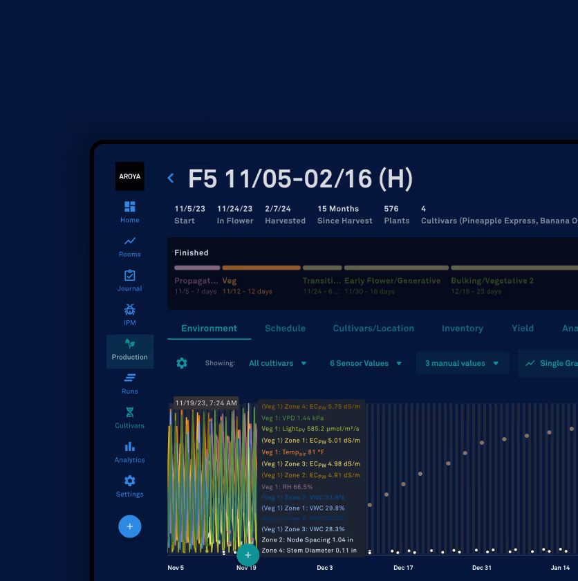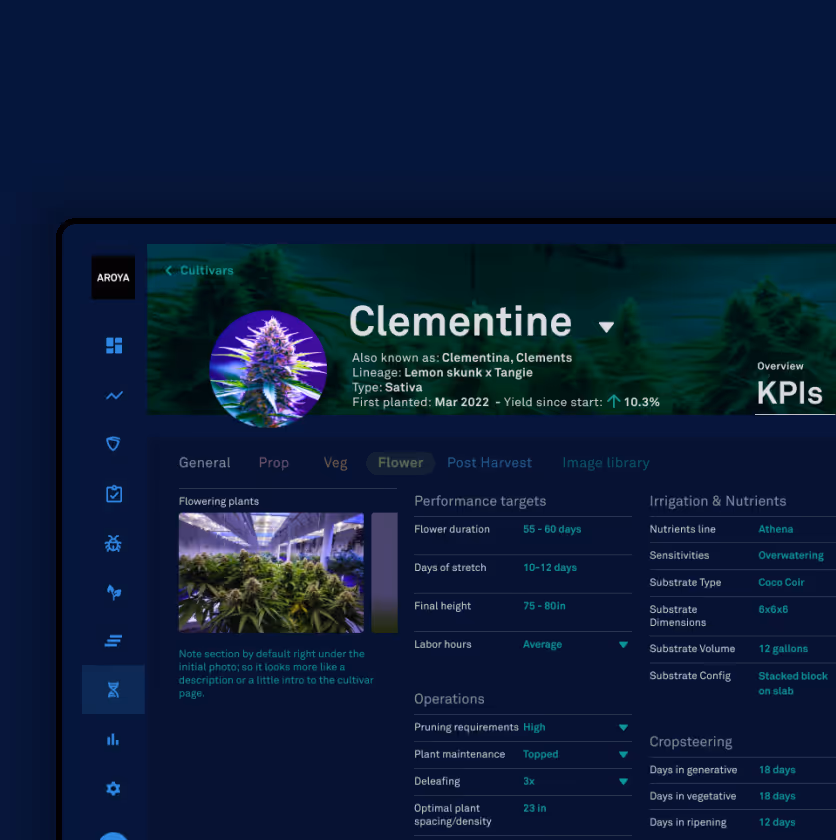 AROYA AI combines plant science and theory with data from your operation to inform intelligent actions and insights. The result is a custom AI model built by your grow, for your grow.