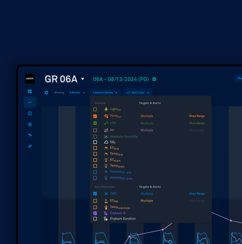 CULTIVAIT powers AROYA’s holistic view of cultivation. Rather than monitoring parameters individually, CULTIVAIT understands how they interact, capturing the full story of your plants' response to their environment – both above and below the substrate.