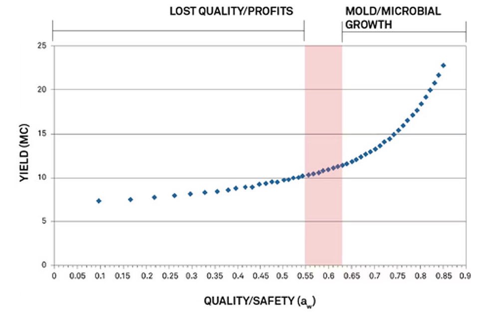 The y-axis shows the full range of moisture content, and the x-axis shows the water activity of cannabis as the bud is being dried.